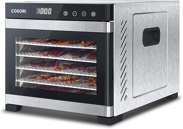 - Includes 6 steel drying trays, 1 fruit roll sheet, and 1 mesh screen