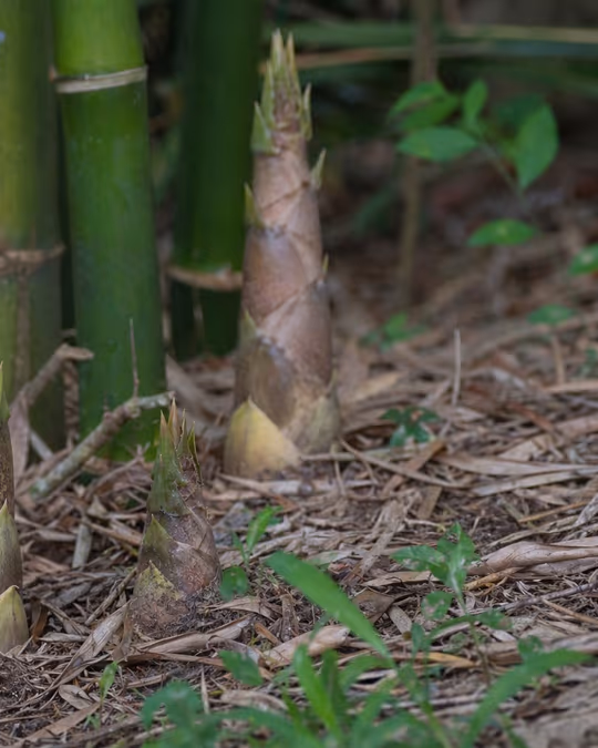 As bamboo shoots grow, they are fed nutrients by their connection to their parent plant. This connection is called a rhizome. It does the same job as an umbilical cord.