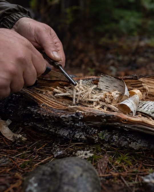 You are left with a thin sheet of bark. Use a sheet of birch bark below your fire to stop moisture coming from underneath. Rip more birch bark into shreds and make a tipi over lit tinder.