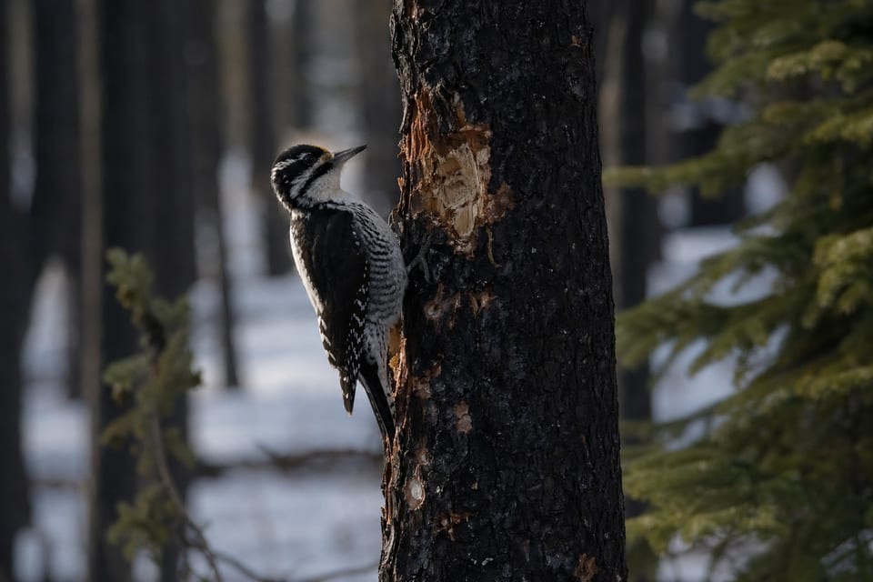 They will also appear in young forests of yards that have a lot of dead trees around left from logging, a fire, or other disturbance. Swamps also have plentiful dead trees for these woodpeckers to find food.