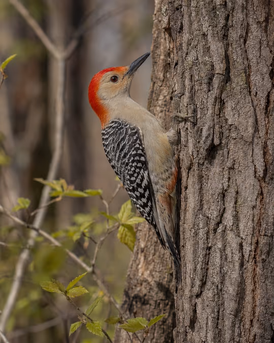Red-bellied woodpeckers have tongues that can push beyond the bill by 5.1 cm (2.0 in). It has barbs coated in sticky saliva, perfect for fishing insects from holes in trees. Males have longer and wider tongues.